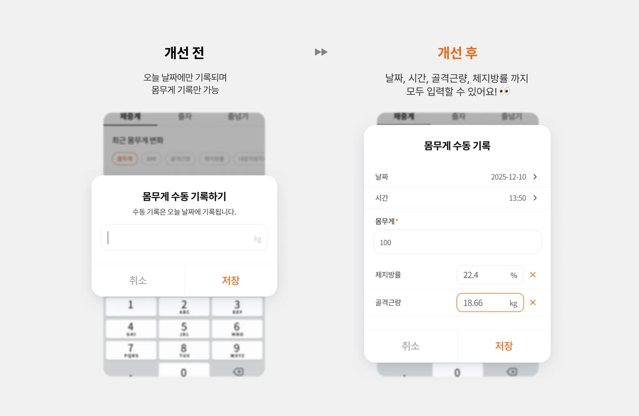 기존에는 당일 기록만 가능했던 몸무게 수동 기록 기능을 개편하여, 원하는 날짜와 시간에 몸무게는 물론 체지방량, 골격근량까지 함께 입력할 수 있습니다.