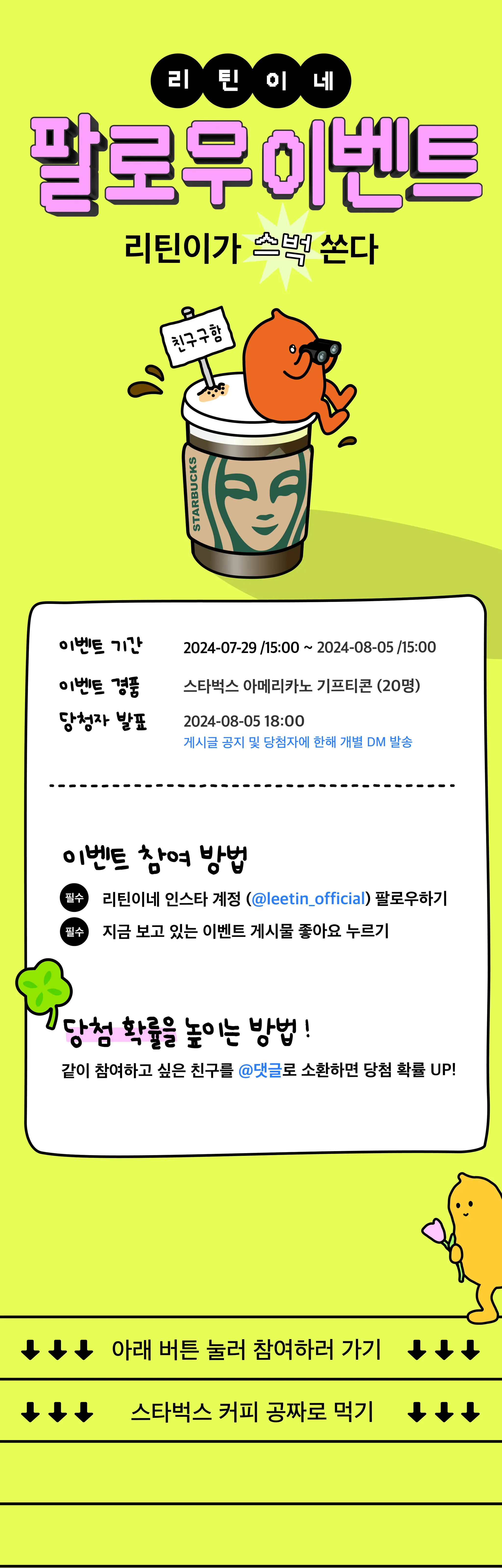 08/05 18시 리틴이네 인스타그램에서 전체 당첨자 목록이 공개되며 당첨자에게는 개별 DM이 발송됩니다.