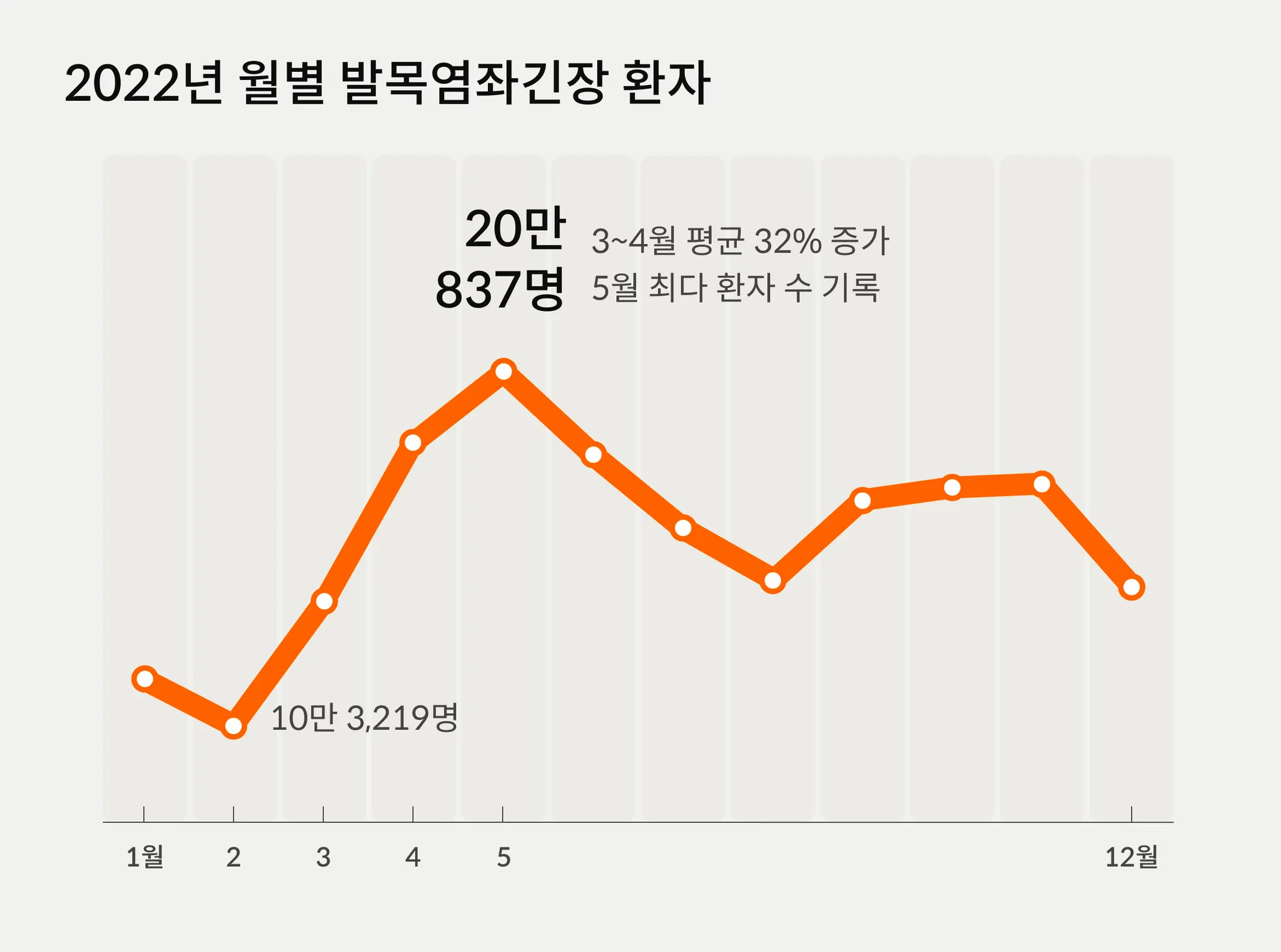 매년 봄이 시작되는 3월부터 근골격계 관련 환자가 증가한다고 해요. 실제로 건강보험심사평가원의 통계 자료에 따르면, 발목염좌긴장 환자는 3~4월에 큰 폭으로 증가하면서 5월에는 20만 명까지 증가하는 모습을 보였어요.